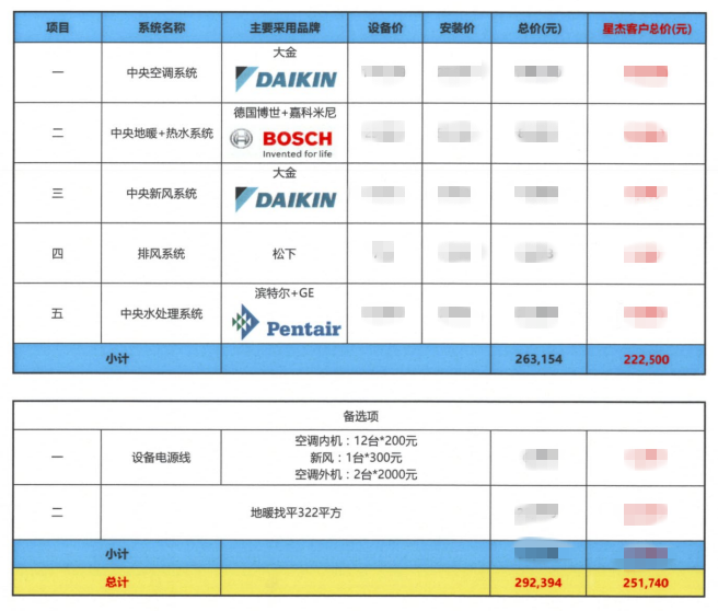 家居集成系統:大金VRV-P中央空調系統 大金新風系統 松下排風扇 博世歐洲之星鍋爐 嘉科米尼地暖管路系統 濱特爾中央水處理 威樂循環泵