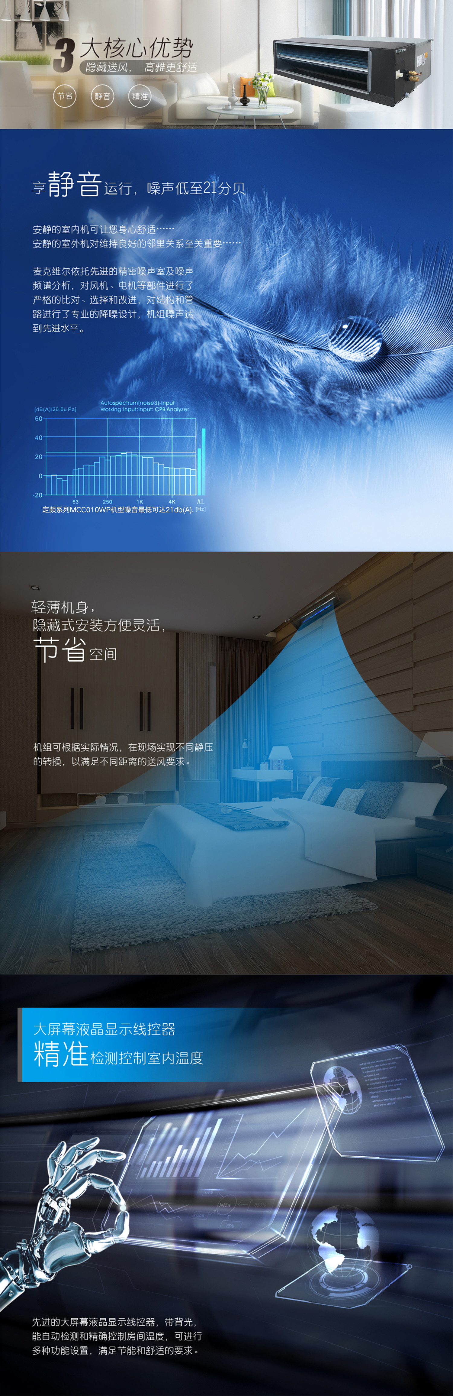 產品理念:采用變頻科技,讓機組時刻處于高效的工作狀態(tài)。應用窄型結構設計,大幅度節(jié)約安裝所用空間,可與各類裝修風格融合。依托于精密噪音實驗室和先進的多通道噪聲分析模擬軟件,通過結構和控制邏輯的優(yōu)化創(chuàng)新,針對性的對室內機噪聲源進行遏制和隔斷,打造安靜的室內空間。