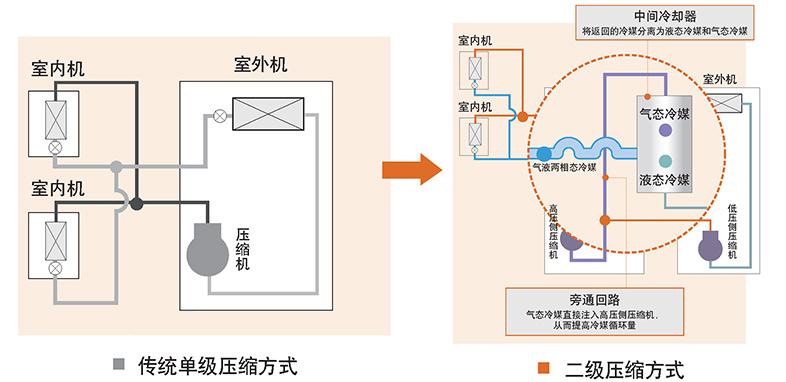 大金二級(jí)壓縮VRV是如何實(shí)現(xiàn)嚴(yán)寒氣候下的高效制熱性?